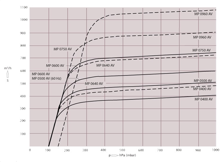 Hz m3/h mbar (abs.) kW V min-1 dB (A) kg
